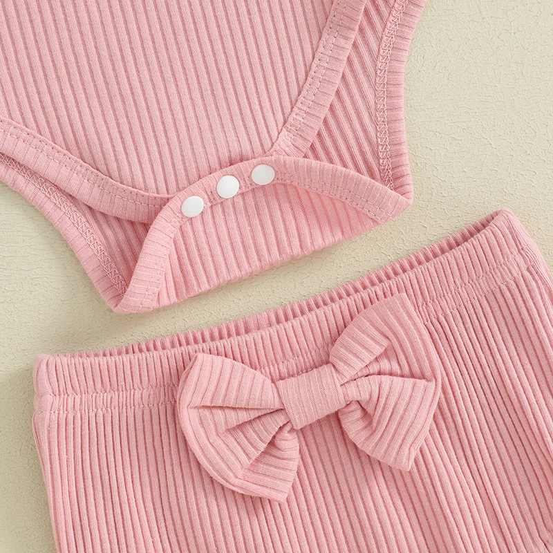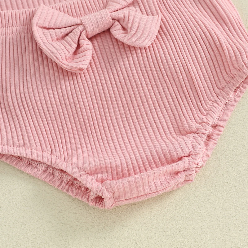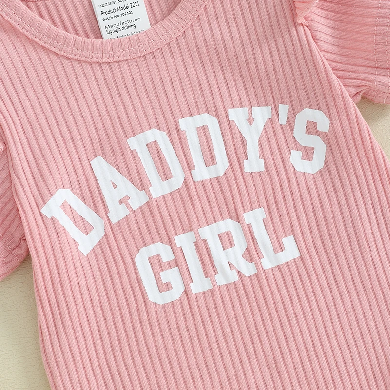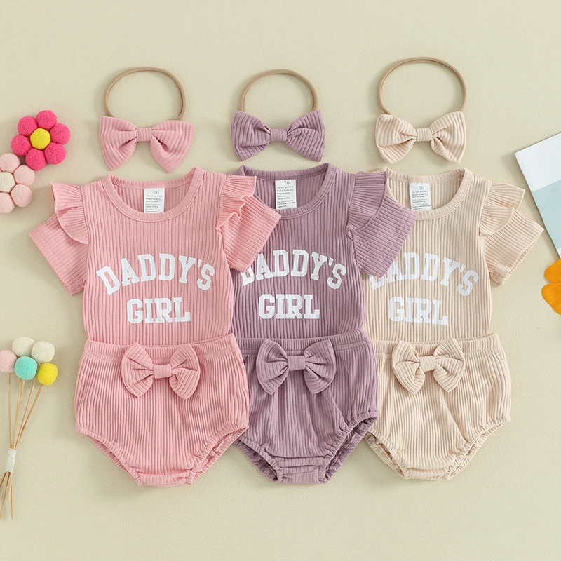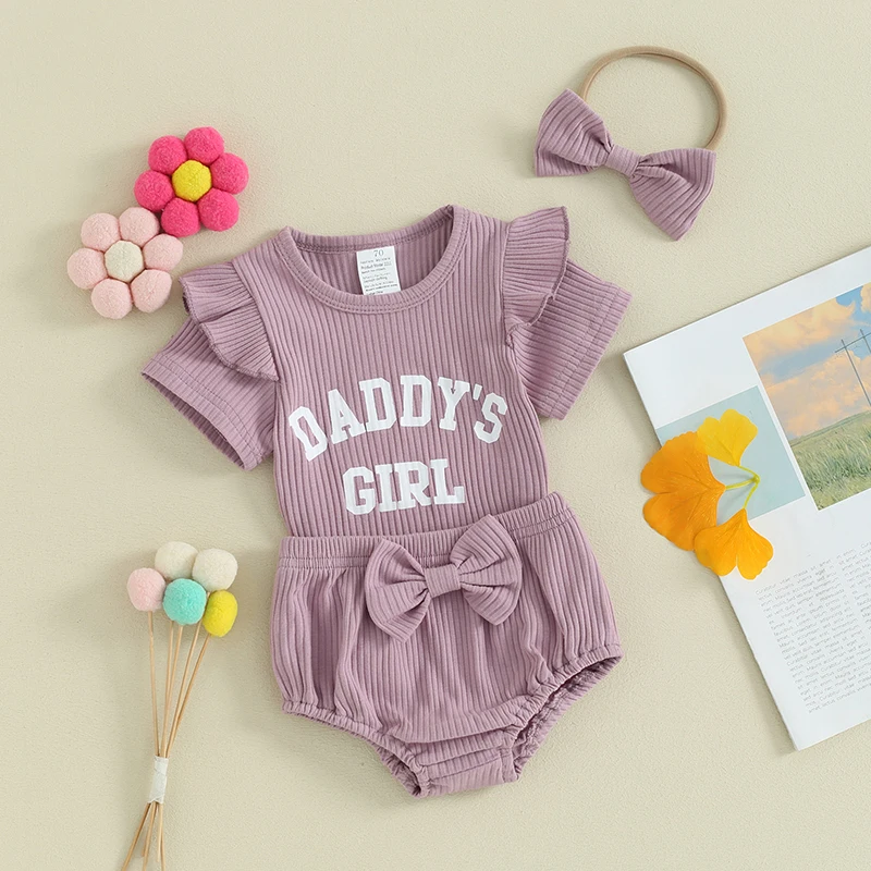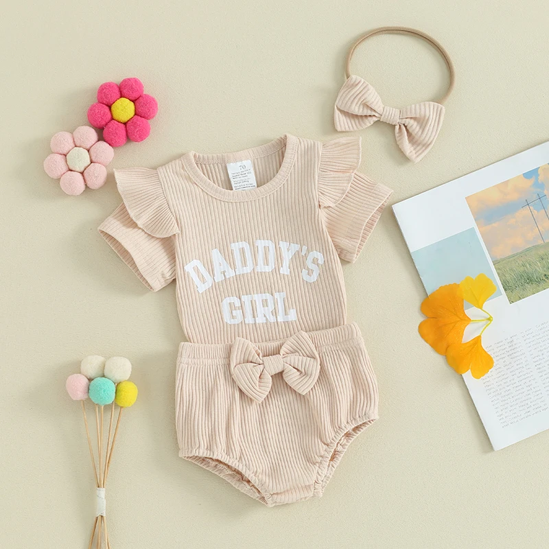 Baby Girls Summer Outfits Letter Print Ribbed Short Sleeve Romper and Shorts Cute Headband 3 Piece Clothes