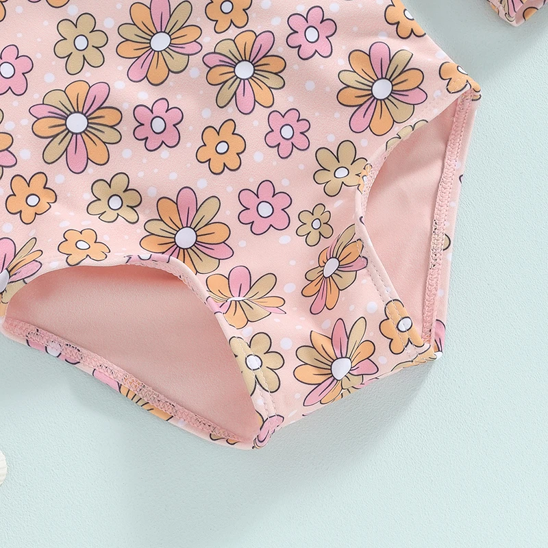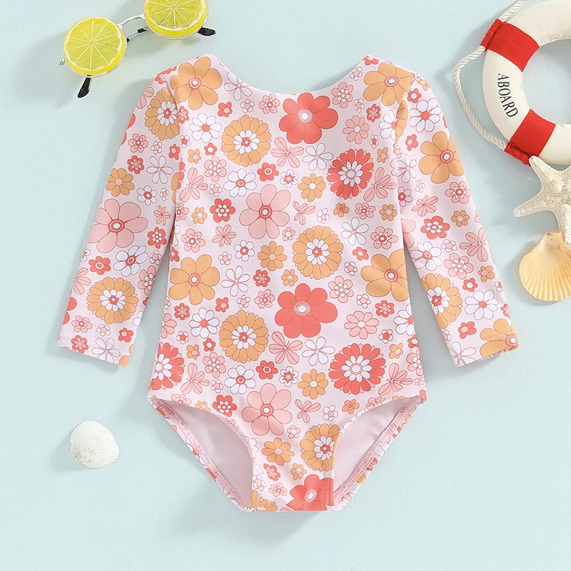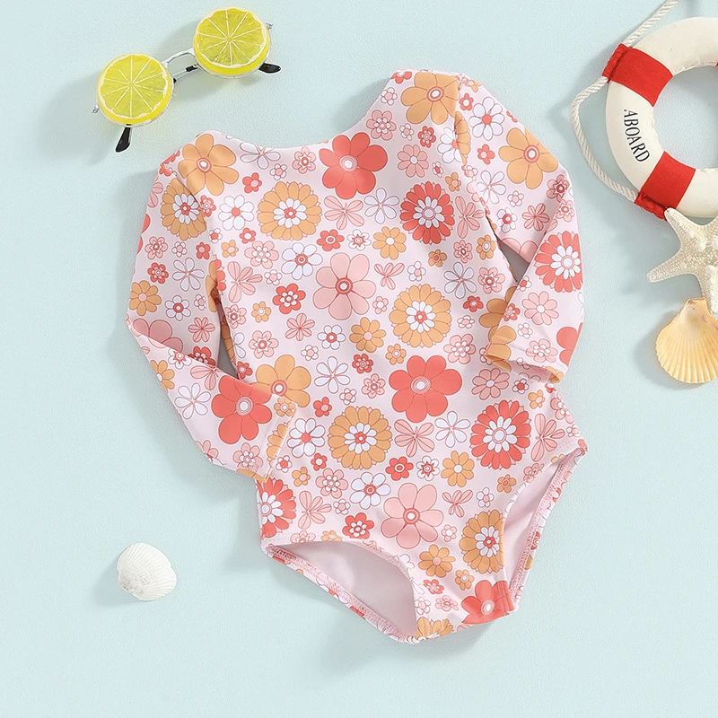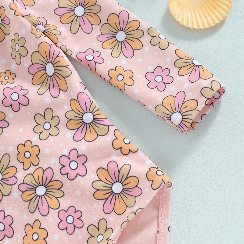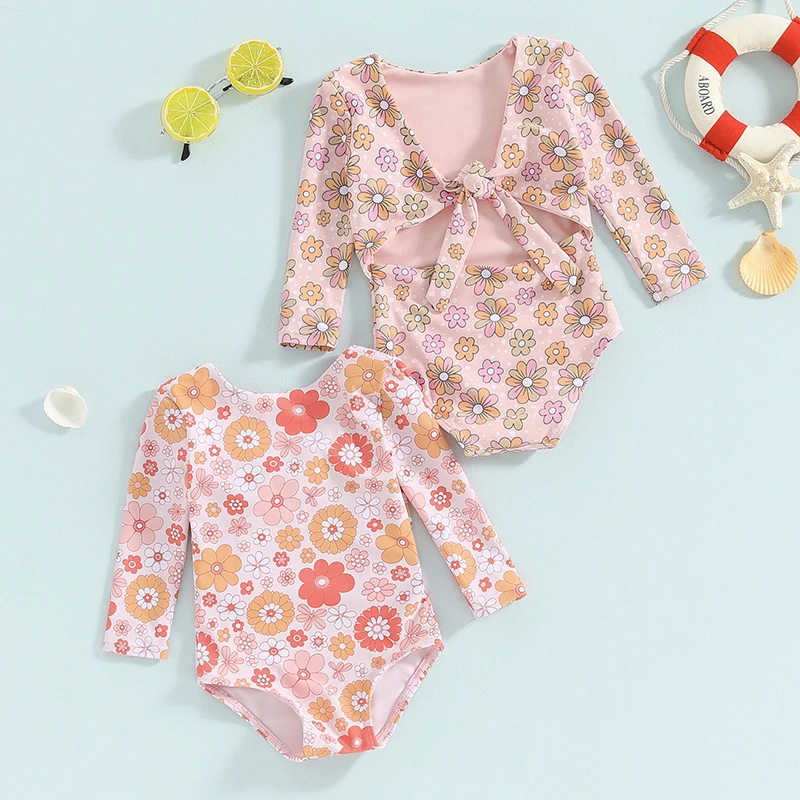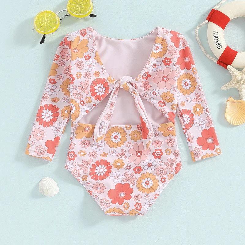 Kids Girls Bikini, Long Sleeve Swimsuit Backless Tie-up Flower Print Swimwear for Summer Beach