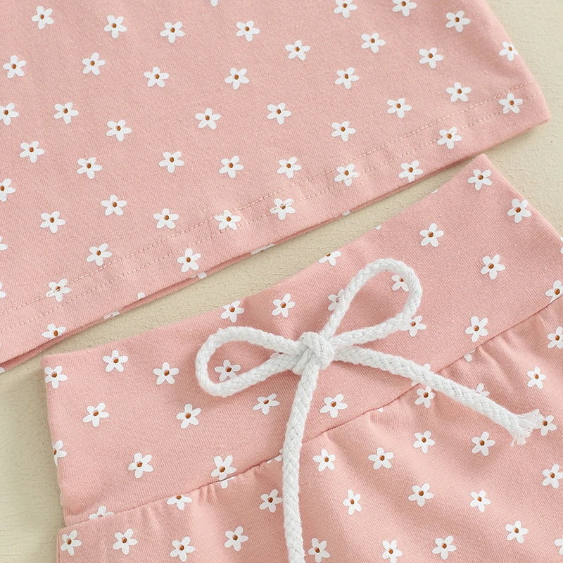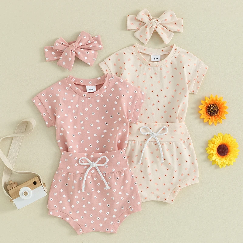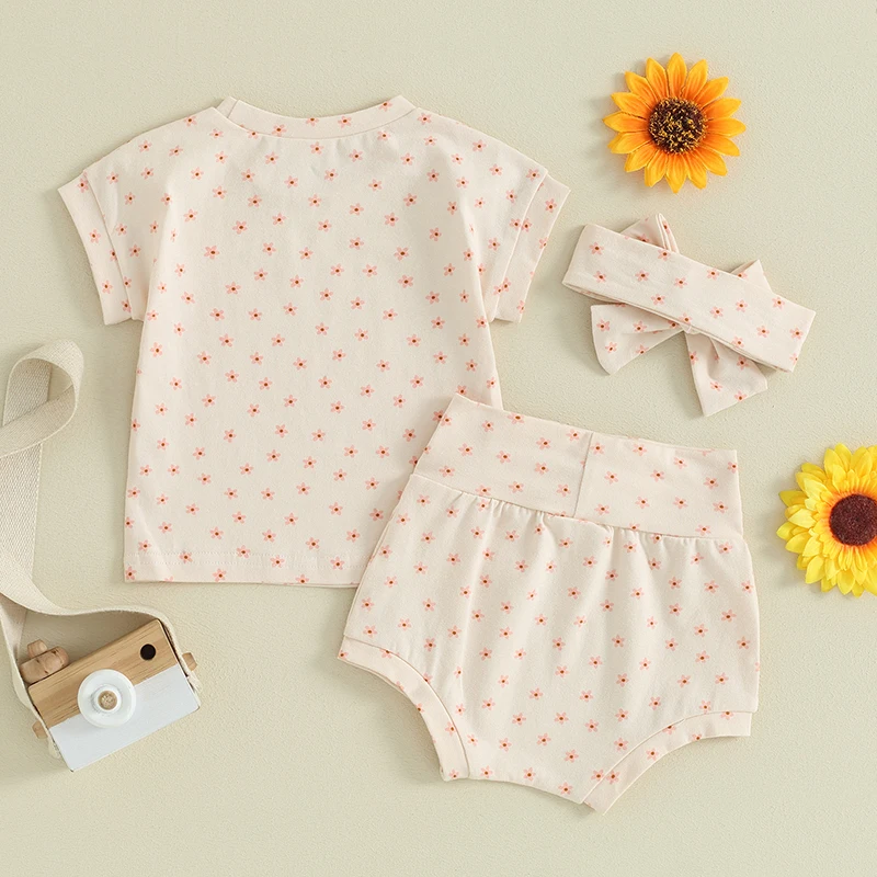 Baby Girl Summer Clothes Flower Print Short Sleeve Round Neck T-Shirt with Shorts and Headband Outfit