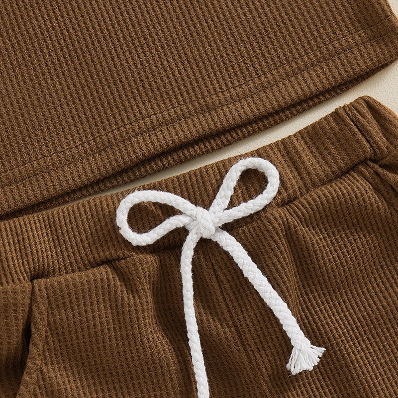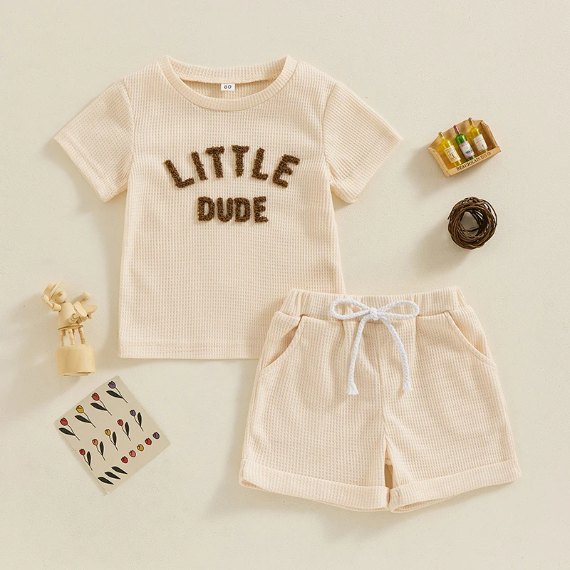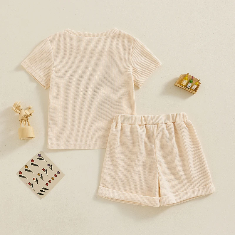 Toddler Baby Boy Summer Clothes Fuzzy Letter Waffle Short Sleeve T-Shirts Tops Elastic Waist Shorts Set Outfit