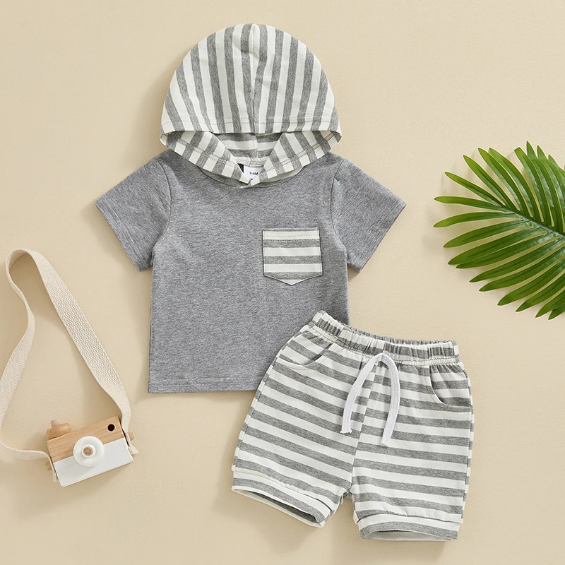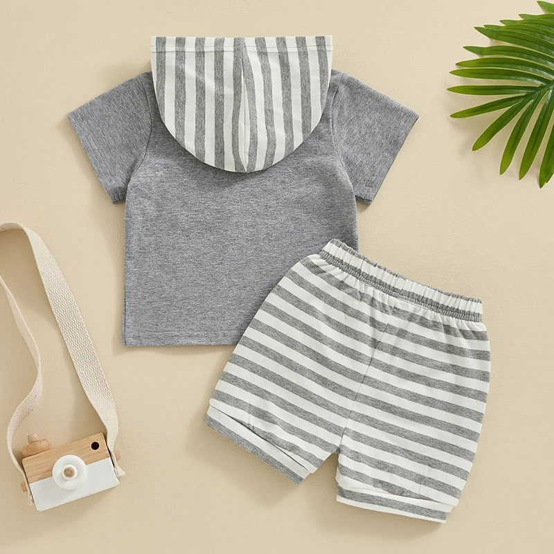 Toddler Boys Summer Shorts Sets Short Sleeve Hooded Tops and Drawstring Striped Shorts Sets