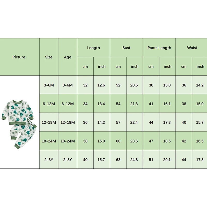 18-24M Tops Length: 14.96 Bust: 23.62 Pant Length: 18.50 Waist: 16.54 Advised Age: 18-24 Months